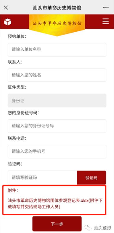 (四)进入“登记信息”界面,团体预约联系人须按要求如实填写本人信息,并在附件处下载《汕头市革命历史博物馆团体参观登记表》,按附件要求如实填写信息,打印纸质,加盖公章,进馆参观前提交现场工作人员登记核实。