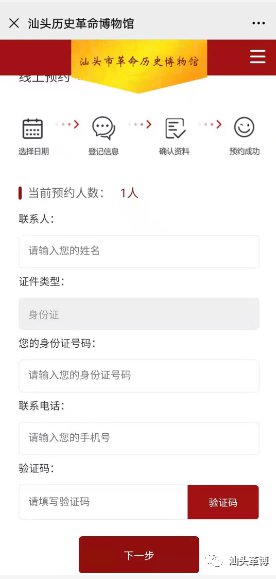(五)预约成功后,请留意手机短信通知或截图预约成功凭证,进馆参观前须提供有效身份证原件、《汕头市革命历史博物馆团体参观登记表》和实名预约成功的手机短信通知或预约成功凭证截图供现场工作人员登记核实。