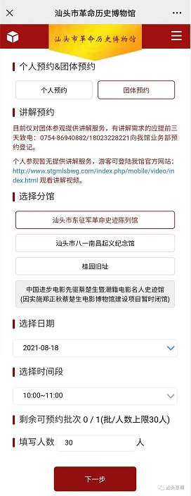 (三)进入预约界面,点击“团体预约”,选择分馆、日期、时间段和填写参观人数,确认后点击“下一步”。