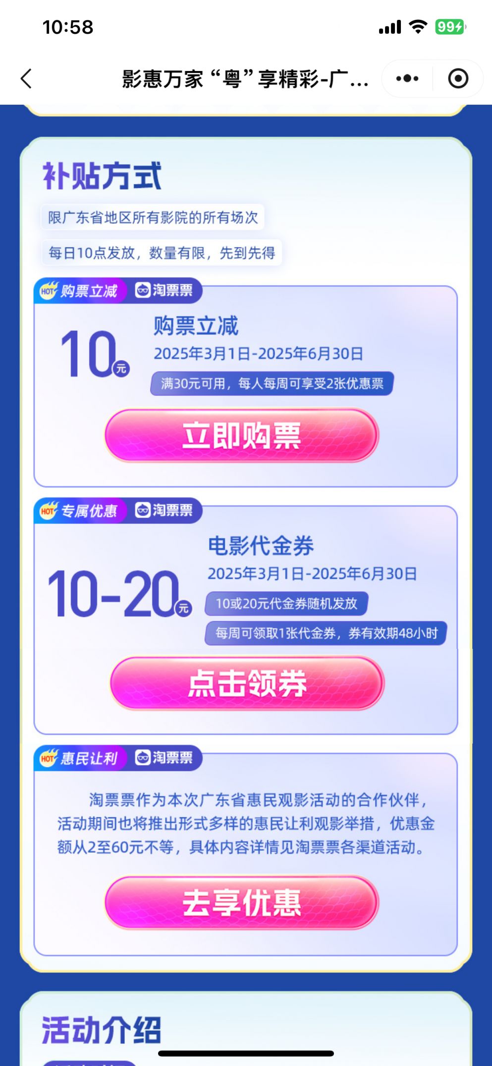 ①购票立减:活动期间,用户可登录淘票票(APP、支付宝小程序、淘宝小程序、微信小程序、大麦APP-电影频道)等任一平台每周抢10元立减优惠名额,无需单独领取,每人每周可享受2张优惠票,订单满30元可用,优惠自动应用于购票结算过程,活动期间限量发放,先到先得,抢完为止。