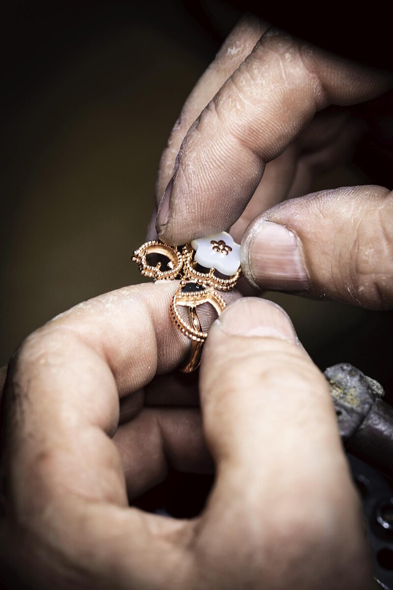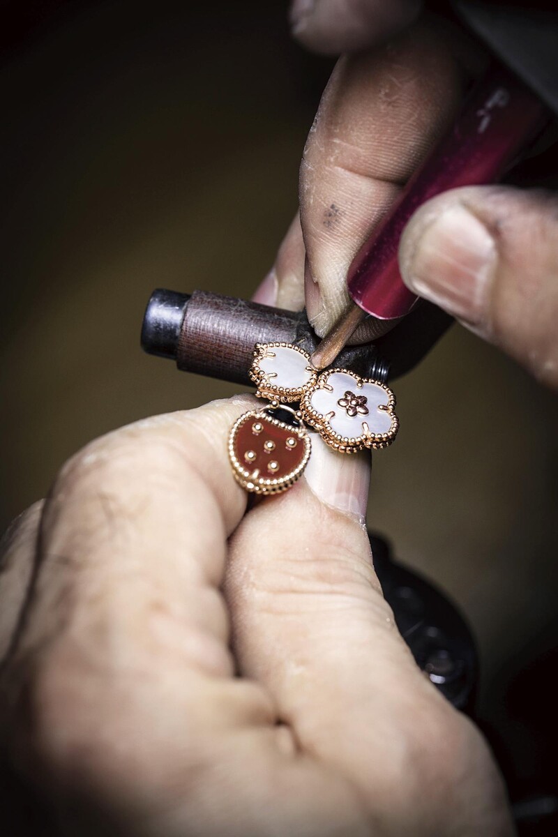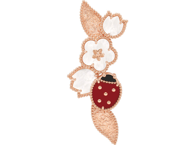 延续与2020年起合作无间的法国艺术家Alexandre Benjamin Navet,Lucky Spring系列在铃兰花蕾、瓢虫和梅花的勾勒下,透过璀璨色彩,生动描绘一幅春意盎然的画卷;于世家别出机杼的顶尖匠艺,陈述包括挑选宝石、切割宝石、珠宝工艺、镶嵌及抛光等每一精细雕琢的繁複工序。其中,白色珍珠母贝所散发的自然虹彩,仿若将晨曦中的露珠凝结为永恆,而红玉髓与缟玛瑙的交织,则如同春风拂过新绿,生机一触即发。系列作品中的梅花无惧寒冬,细緻构成五瓣合抱的花冠,象徵坚韧与重生,盛放春日的第一声讚颂!另外,在世家大自然世界中,格外重要的活泼瓢虫,则是镶嵌耀眼的红玉髓翅膀,与玄黑色缟玛瑙、珍珠母贝和谐协奏;振翅欲飞的镜面抛光玫瑰金身躯,更与手工逐一雕琢的金质圆点相互辉映,并纤丽停伫于Between the Finger指间戒上,在灿烂盛开的梅花和含苞待放的铃兰之间翩翩飞舞,蔓延出充满春日共生气息的诗意乐园。