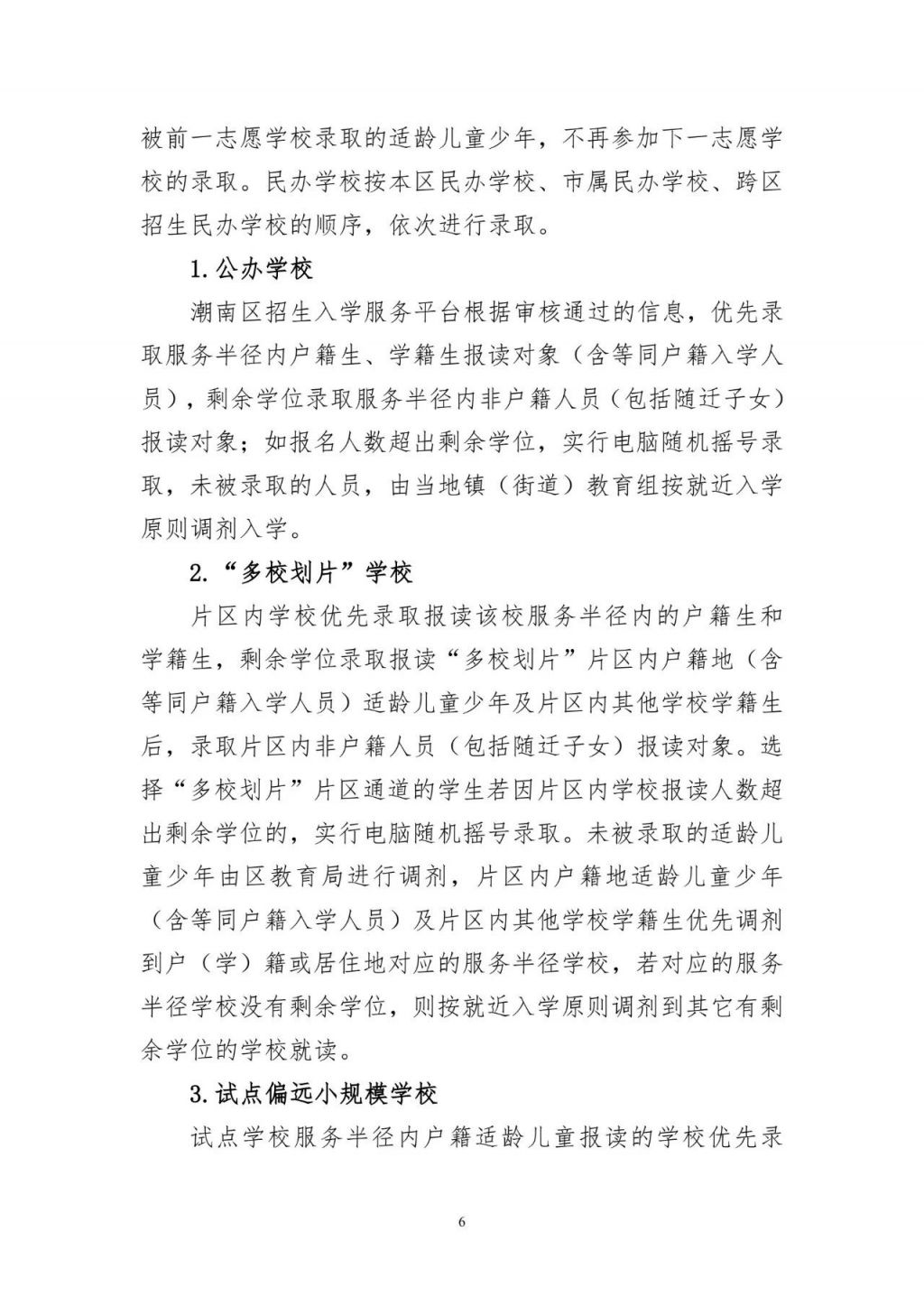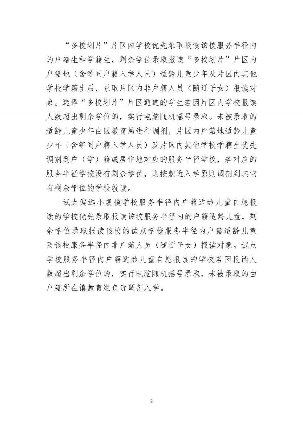 片区内学校优先录取报读该校服务半径内的户籍生和学籍生,剩余学位录取报读“多校划片”片区内户籍地(含等同户籍入学人员)适龄儿童少年及片区内其他学校学籍生后,录取片区内非户籍人员(随迁子女)报读对象。选择“多校划片”片区通道的学生若因片区内学校报读人数超出剩余学位的,实行电脑随机摇号录取。未被录取的适龄儿童少年由区教育局进行调剂,片区内户籍地适龄儿童少年(含等同户籍入学人员)及片区内其他学校学籍生优先调剂到户(学)籍或居住地对应的服务半径学校若对应的服务半径学校没有剩余学位,则按就近入学原则调剂到其它有剩余学位的学校就读。