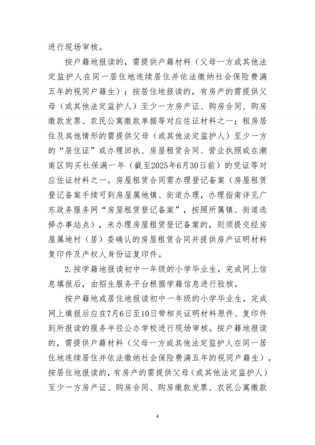 完成网上填报后,所有报读小学一年级的适龄儿童家长或其他法定监护人应在7月6日至7月10日带齐相关证明材料原件、复印件到所报读的服务半径公办学校进行现场审核。按户籍地报读的,需提供户籍材料(父母一方或其他法定监护人在同一居住地连续居住并依法缴纳社会保险费满五年的视同户籍生)。按居住地报读的,有房产的需提供父母(或其他法定监护人)至少一方房产证、购房合同、购房缴款发票、农民公寓缴款单据等对应佐证材料之一;租房居住及其他情形的需提供父母(或其他法定监护人)至少一方的“居住证”或办理回执、房屋租赁合同、营业执照或在潮南区购买社保满一年(截至2025年6月30日前)的凭证等对应佐证材料之一。房屋租赁合同需办理登记备案(房屋租赁登记备案手续可到房屋属地镇、街道办理,办理指南详见广东政务服务网“房屋租赁登记备案”,按照所属镇、街道选择办事站点),未办理房屋租赁登记备案的,则须提交经房屋属地村(居)委确认的房屋租赁合同并提供房产证明材料复印件及产权人身份证复印件。