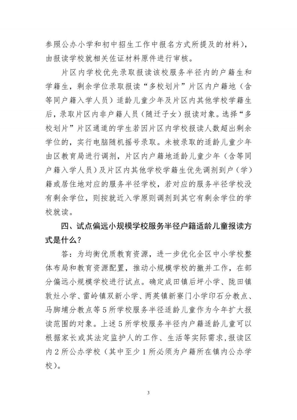 为均衡优质教育资源,进一步优化全区中小学校整体布局和教育资源配置,推动小规模学校的撤并工作,在部分偏远小规模学校进行试点。确定成田镇后坪小学、陇田镇敦灶小学、雷岭镇双新小学、两英镇新寮门小学印石分教点、马脚埔分教点等5所学校服务半径适龄儿童作为今年扩大报读范围的对象。上述5所学校服务半径内户籍适龄儿童可以根据家长或其法定监护人的工作、生活等实际需求,报读区内2所公办学校(其中至少1所必须为户籍所在镇内公办学校)。