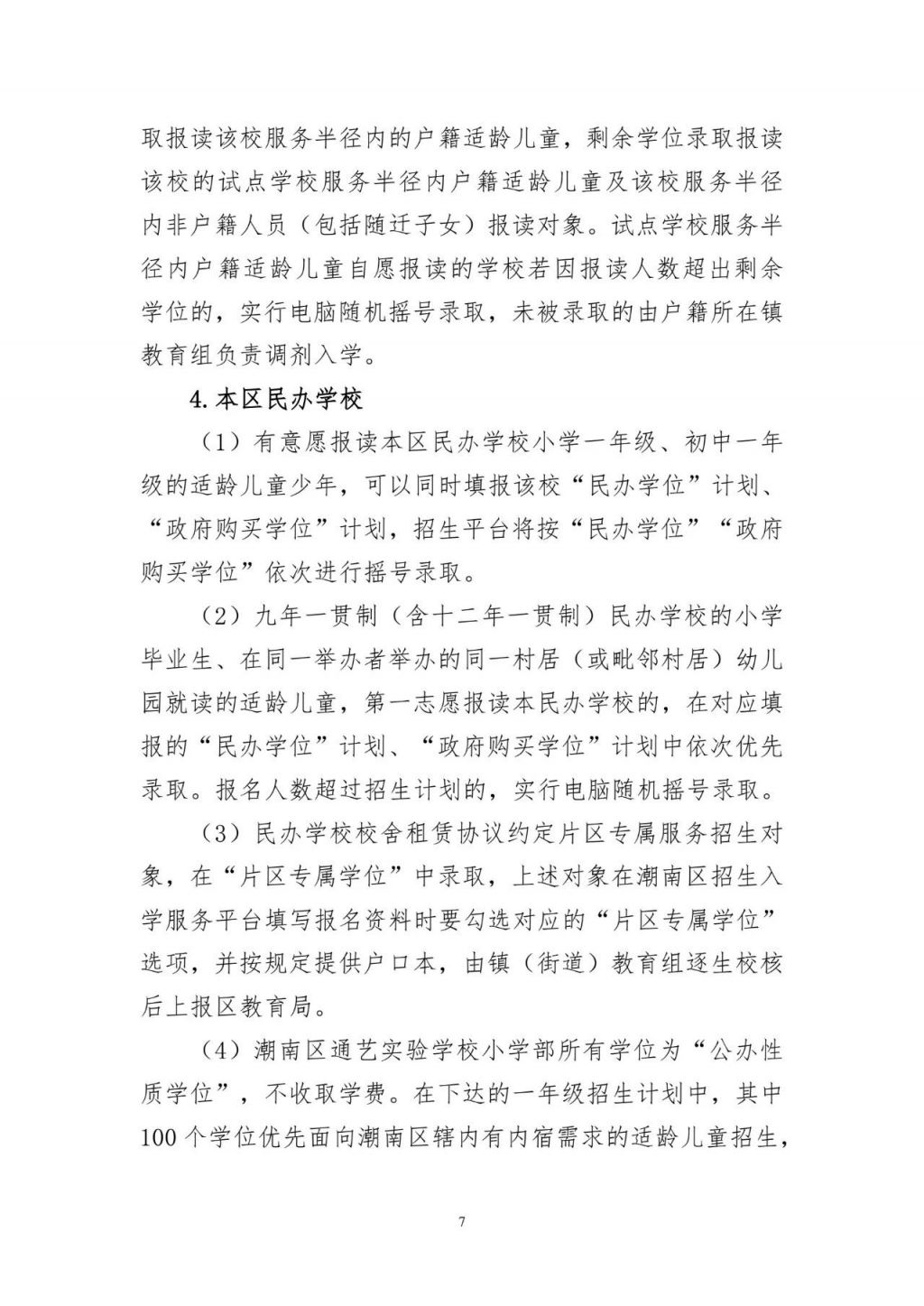 民办学校招生计划分为“民办学位”“政府购买学位”“公办性质学位”及“片区专属学位”。“片区专属学位”面向校舍租赁协议约定的片区专属服务对象招生,由属地教育组逐生校核后直接录取,区教育局在已下达招生计划外追加片区专属招生计划:九年一贯制(含十二年一贯制)民办学校的小学毕业生、在同一举办者举办的同一村居(或毗邻村居)幼儿园就读的适龄儿童第一志愿报读本民办学校的,在对应填报的“民办学位”计划“政府购买学位”计划中依次优先录取,剩余学位向社会开放;报名人数超过招生计划的,实行电脑随机摇号录取。