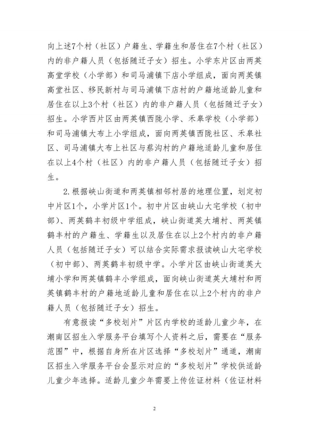 保留2024年两英镇、司马浦镇划定多校招生片区,即两英司马浦两镇相邻村居,包含两英镇西陇社区、禾皋社区、高堂社区、移民新村(含成婆村、七户村、玉石村及西坑村)和司马浦镇大布上社区、蔡沟村、下店村等7个村(社区)。今年持续推进“多校划片”招生模式,新增峡山街道、两英镇相邻村居,包含峡山街道英大埔村和两英镇鹤丰村2个村,采用“多校划片”模式招生,实现片区内公办教育资源共享。