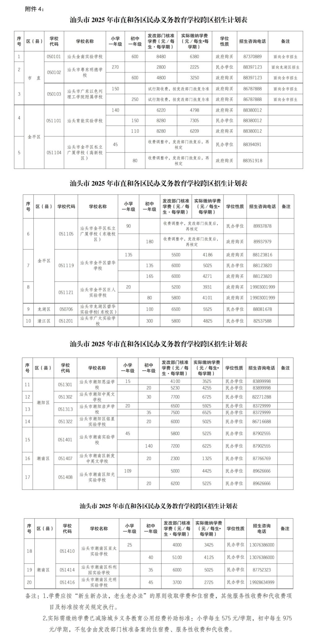 (4)区外民办学校招生计划:市属民办学校、其他区属民办学校跨区招生计划由市教育局公布,面向全区小学毕业生(包括澄海区户籍在异地借读需要回澄海区升学的毕业生)招生。