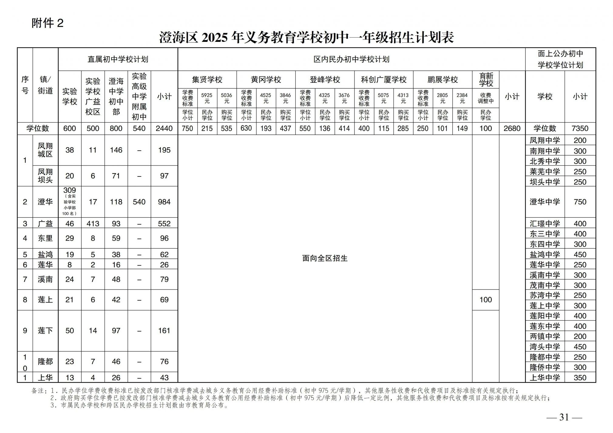 (1)区面上公办学校初中一年级招生计划:2025年秋季学期招生计划详见《澄海区2025年义务教育学校初中一年级招生计划表》,各镇(街道)所在初中学校面向本镇(街道)所属小学毕业生(包括澄海区户籍在异地借读需回澄海区升学的毕业生)招生,其中两镇中学招生200名(含定向录取程洋冈片以外莲下镇小学毕业生60名)。镇(街道)内有多所初中的由各镇(街道)制订方案后于7月10日前报区教育局一并实施。
