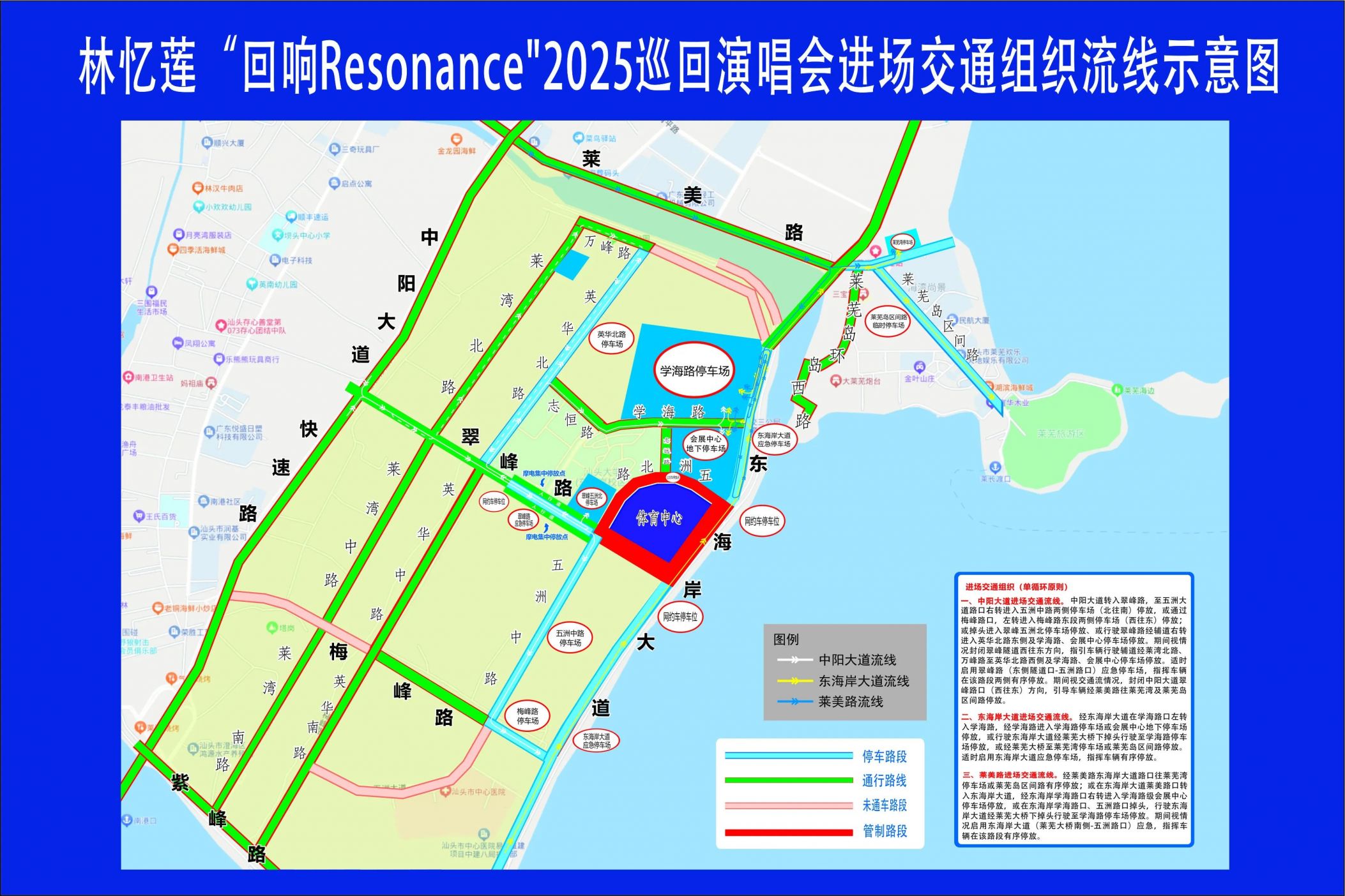 2025汕头林忆莲演唱会进场退场交通路线 (一)进场路线 1、中阳大道进场交通流线 中阳大道转入翠峰路,至五洲大道路口右转进入五洲中路两侧停车场(北往南)停放,或通过梅峰路口,左转进入梅峰路东段两侧停车场(西往东)停放;或掉头进入翠峰五洲北停车场停放、或行驶翠峰路经辅道右转进入英华北路东侧及学海路、会展中心停车场停放。期间视情况封闭翠峰隧道西往东方向,指引车辆行驶辅道经莱湾北路、万峰路至英华北路西侧及学海路、会展中心停车场停放。适时启用翠峰路(东侧隧道口-五洲路口)应急停车场,指挥车辆在该路段两侧有序停放。期间视交通流情况,封闭中阳大道翠峰路口(西往东)方向,引导车辆经莱美路往莱芜湾及莱芜岛区间路停放。 2、东海岸大道进场交通流线 经东海岸大道在学海路口左转入学海路,经学海路进入学海路停车场或会展中心地下停车场停放,或行驶东海岸大道经莱芜大桥下掉头行驶至学海路停车场停放,或经莱芜大桥至莱芜湾停车场或莱芜岛区间路停放。适时启用东海岸大道应急停车场,指挥车辆有序停放。 3、莱美路进场交通流线 经莱美路东海岸大道路口往莱芜湾停车场或莱芜岛区间路有序停放;或在东海岸大道莱美路口转入东海岸大道,经东海岸学海路口右转进入学海路级会展中心停车场停放,或在东海岸学海路口、五洲路口掉头,行驶东海岸大道经莱芜大桥下掉头行驶至学海路停车场停放。期间视情况启用东海岸大道(莱芜大桥南侧-五洲路口)应急,指挥车辆在该路段有序停放。  举报 举报