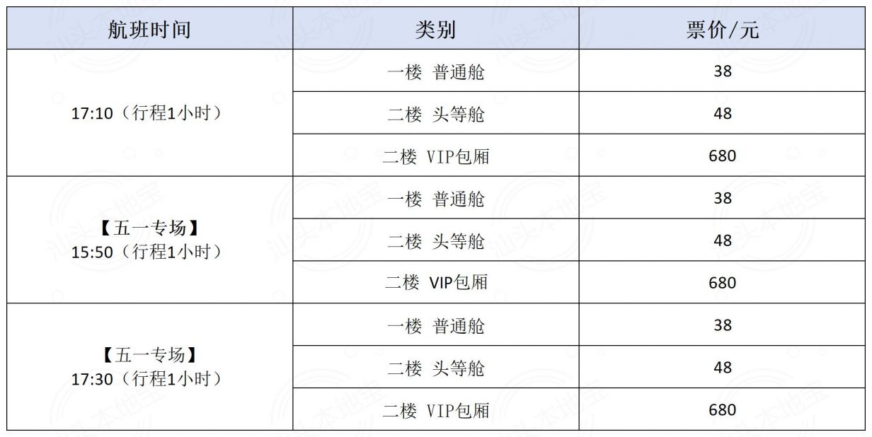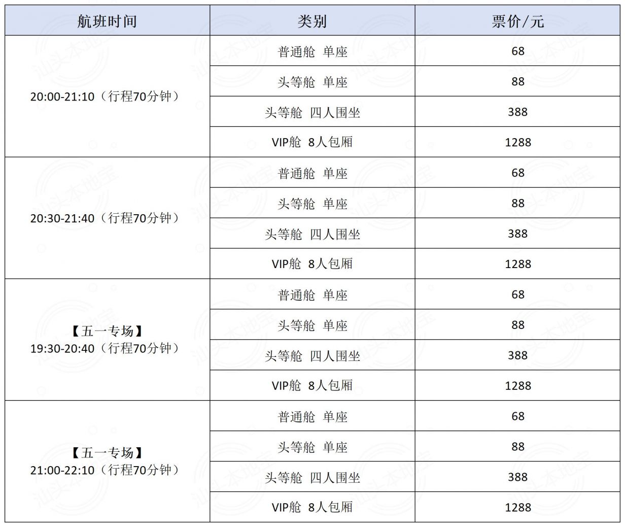 #### 2. 船班时间 - "汕头市区至南澳岛":每天有多班船,具体时间请查询官方发布的时刻表。 - "南澳岛至汕头市区":与汕头市区至南澳岛的船班时间相对应。